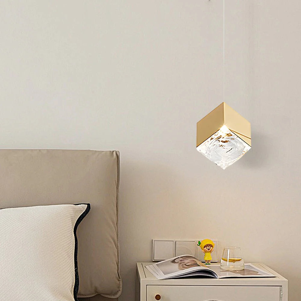 This cascading cube pendant light is a modern luxury statement, featuring polished gold metal caps atop textured crystal cubes, suspended at varying heights by thin wires. When illuminated, the warm light refracts through the rippled crystal to create a soft, luminous glow, casting a sophisticated geometric ambiance.
