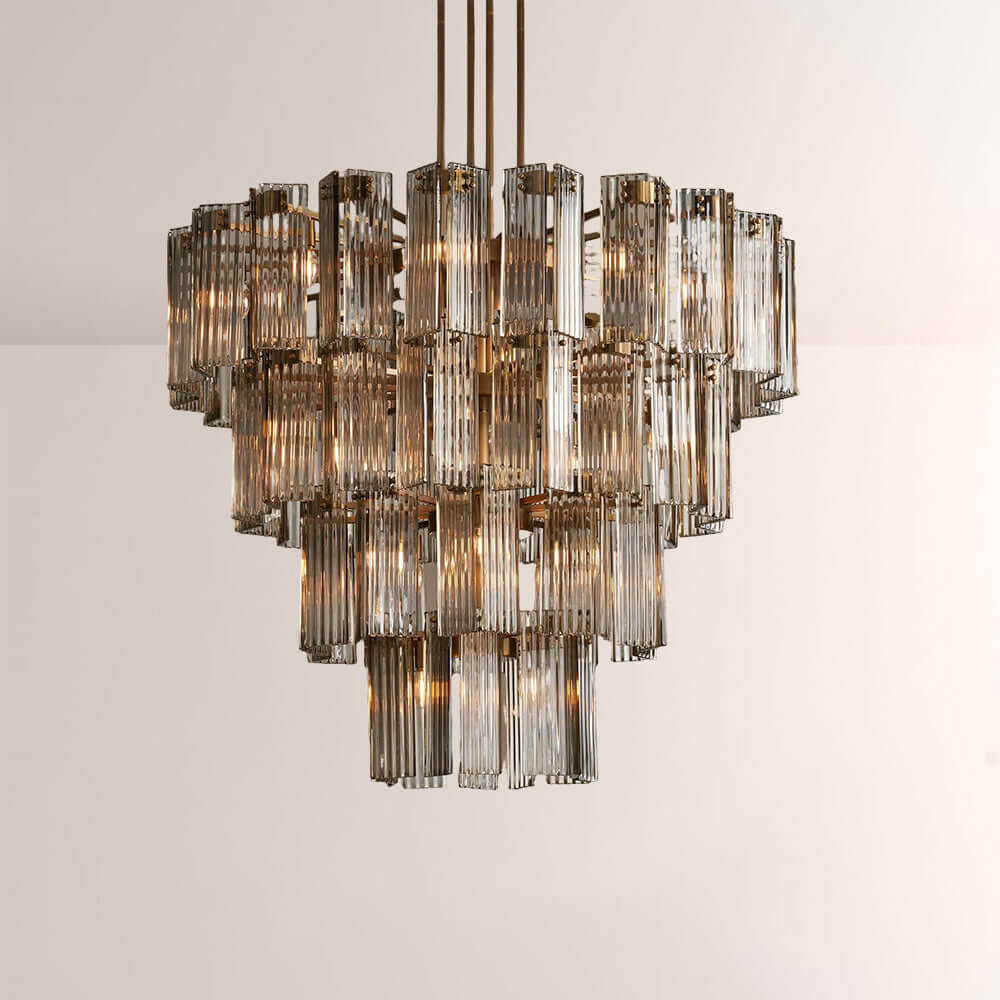The Delsia Collection brings old Hollywood glamour into the modern era with a refined interpretation of classic silhouettes. Beveled glass panels are elegantly arranged around a steel frame, casting warm, radiant light and creating a dramatic yet timeless presence in any space.