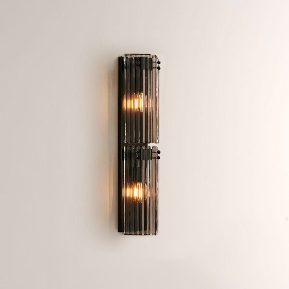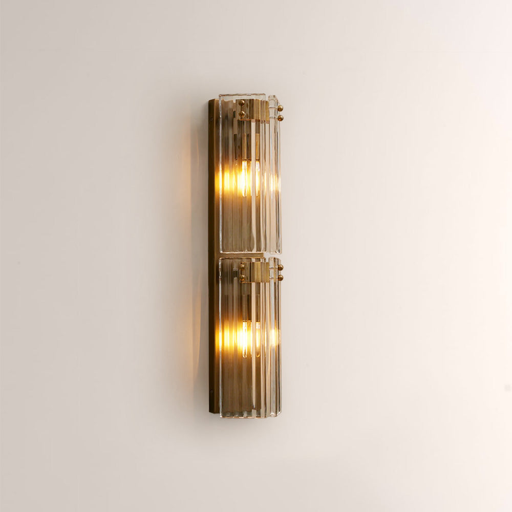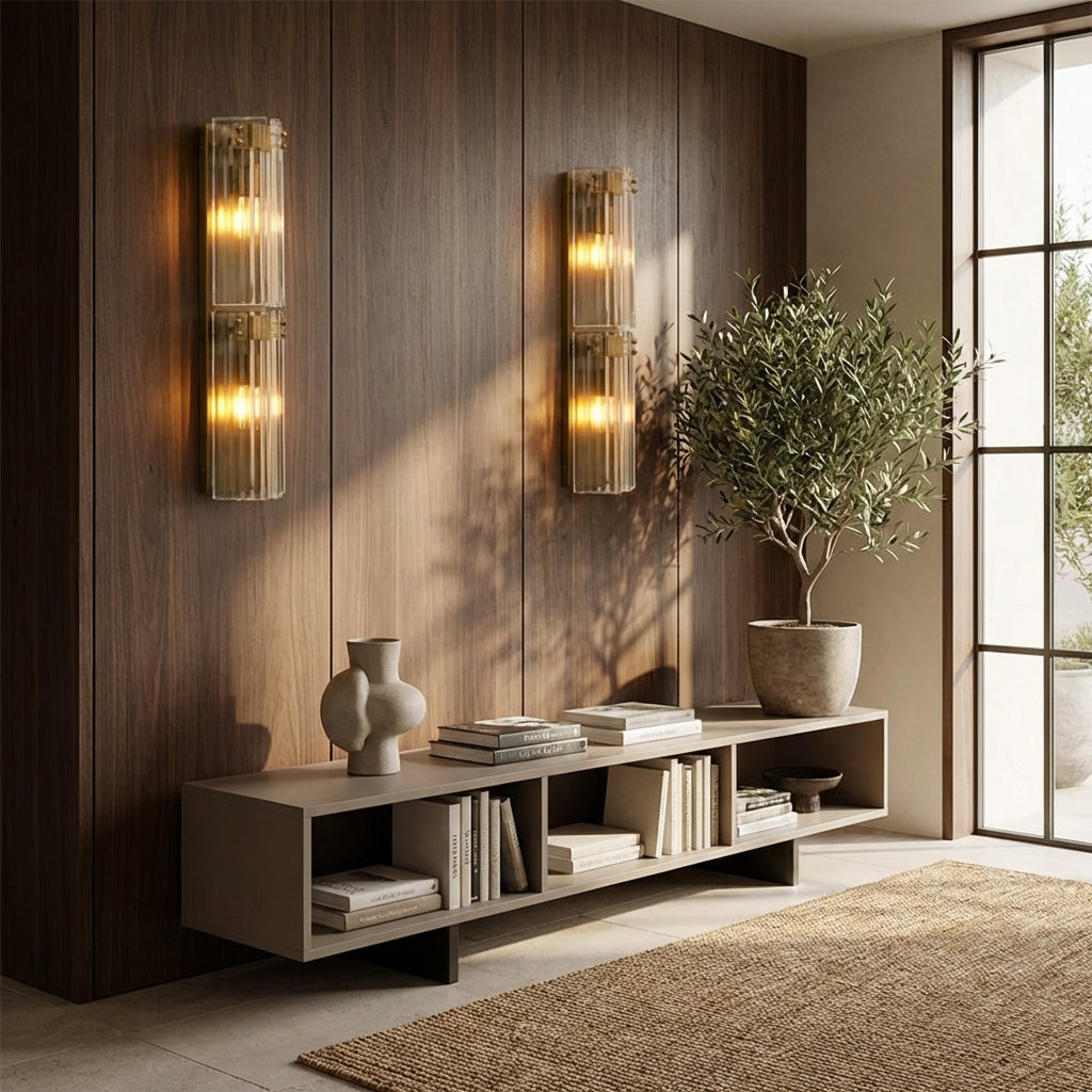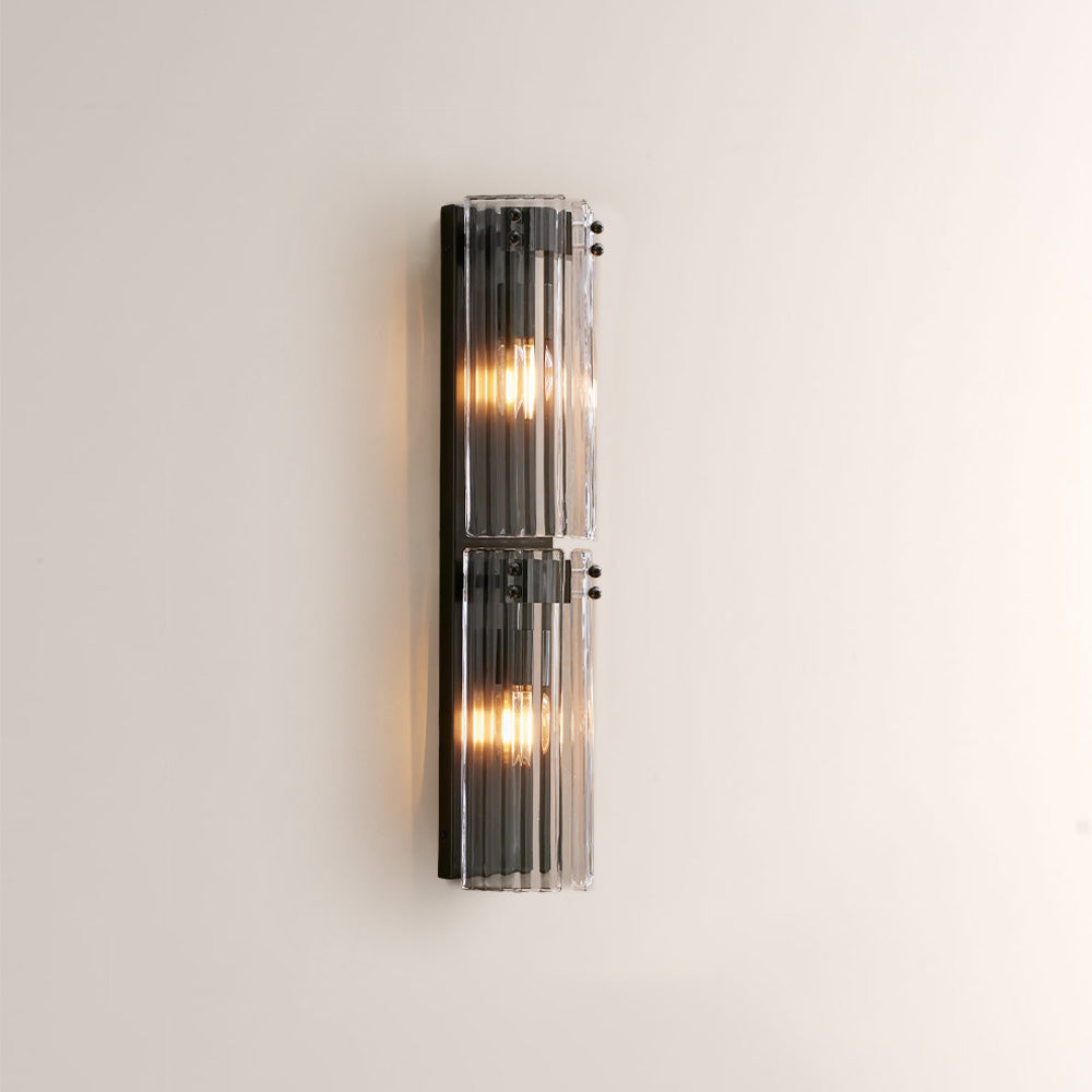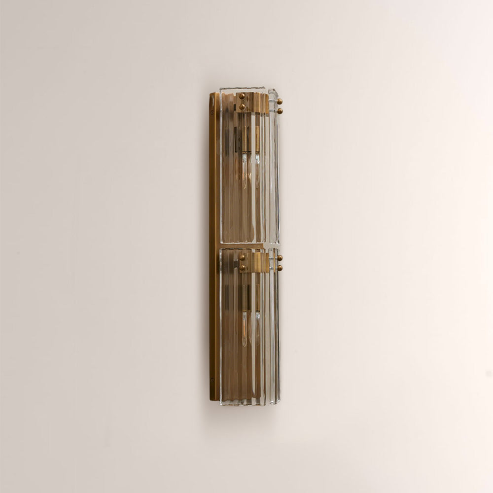 The Delsia Wall Sconce is a modern statement piece, featuring vertical fluted glass panels that refract warm light into a luminous, textured glow. Available in aged brass or matte black, its sleek, linear design elevates contemporary bathrooms, hallways, and dining spaces with refined, art-deco inspired luxury.