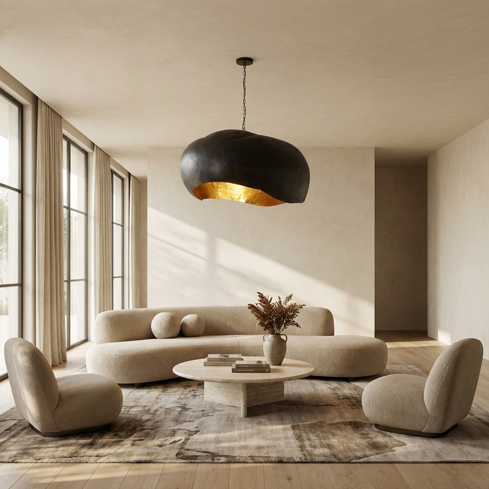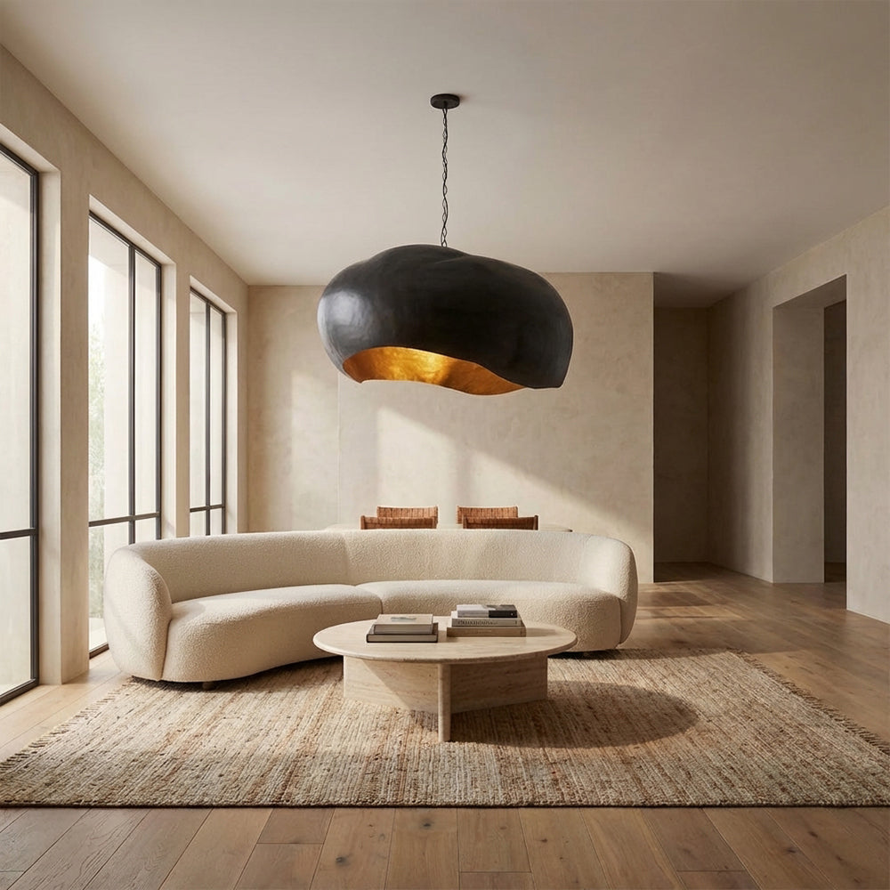 Make a bold sculptural statement with the Finn Hammered Metal Collection. Each fixture features a hand-hammered dark metal exterior, contrasted by a luminous gold interior that casts a warm, ambient glow. Available in dome and cone silhouettes, including a dramatic 48" dome option, these pendants blend industrial edge with modern elegance—perfect for elevating dining rooms, entryways, or contemporary living spaces.