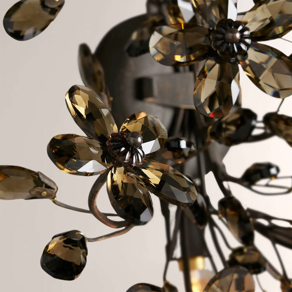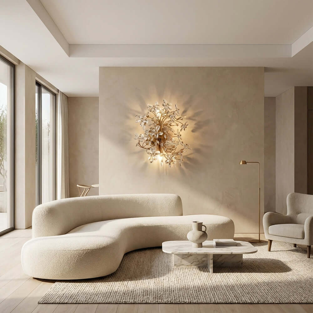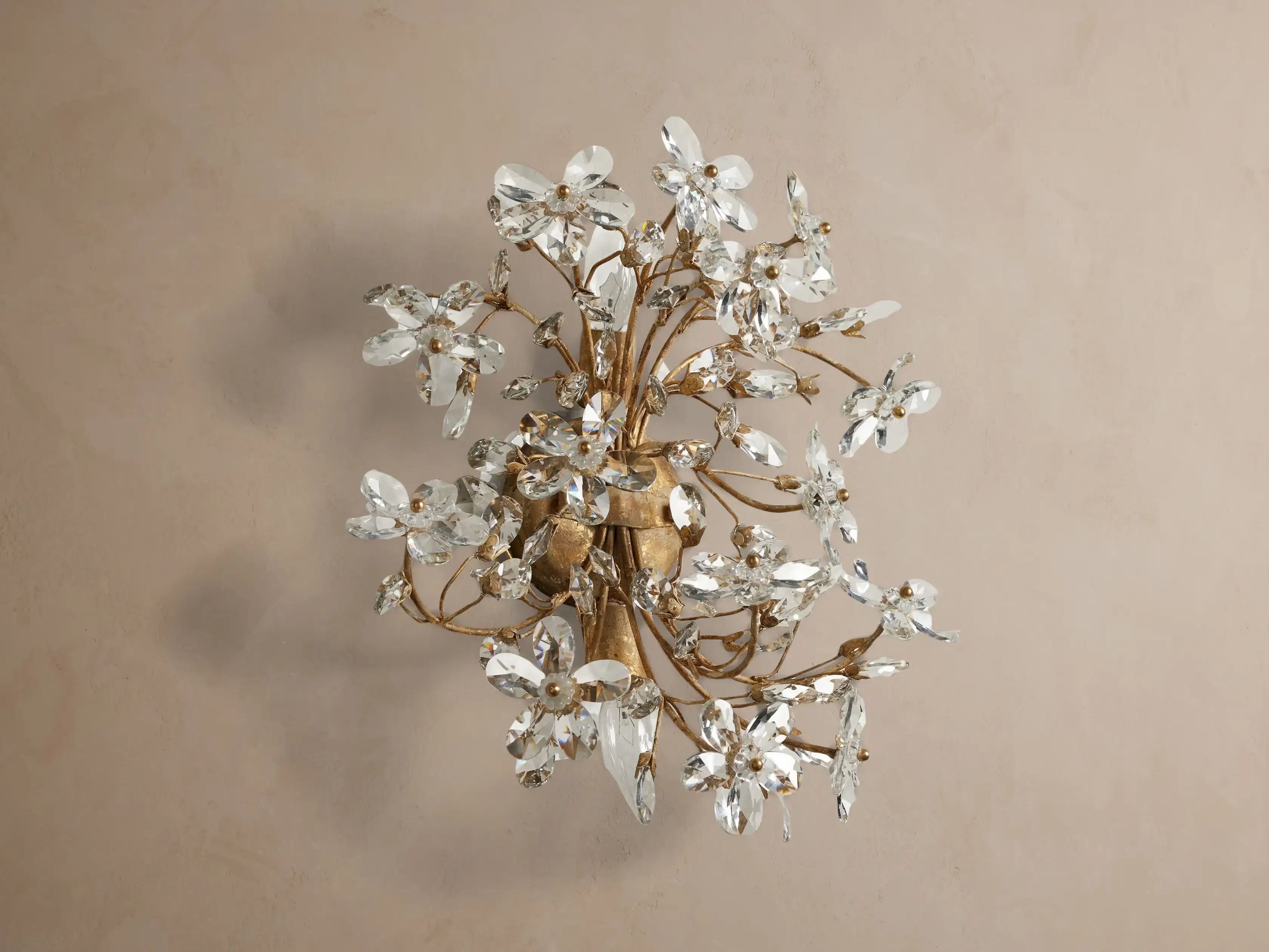 The Fiora Wall Sconce reimagines botanical elegance with hand-faceted clear crystal blossoms anchored to a hand-wrought metal branch frame.