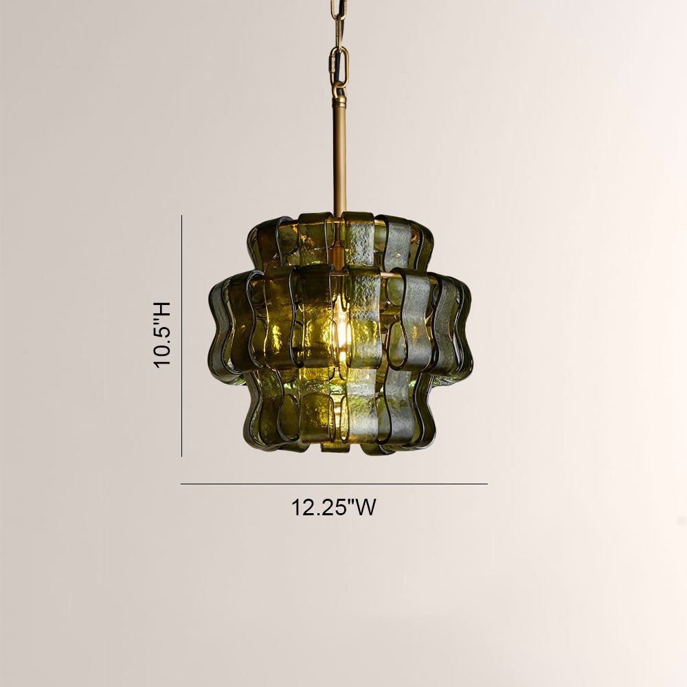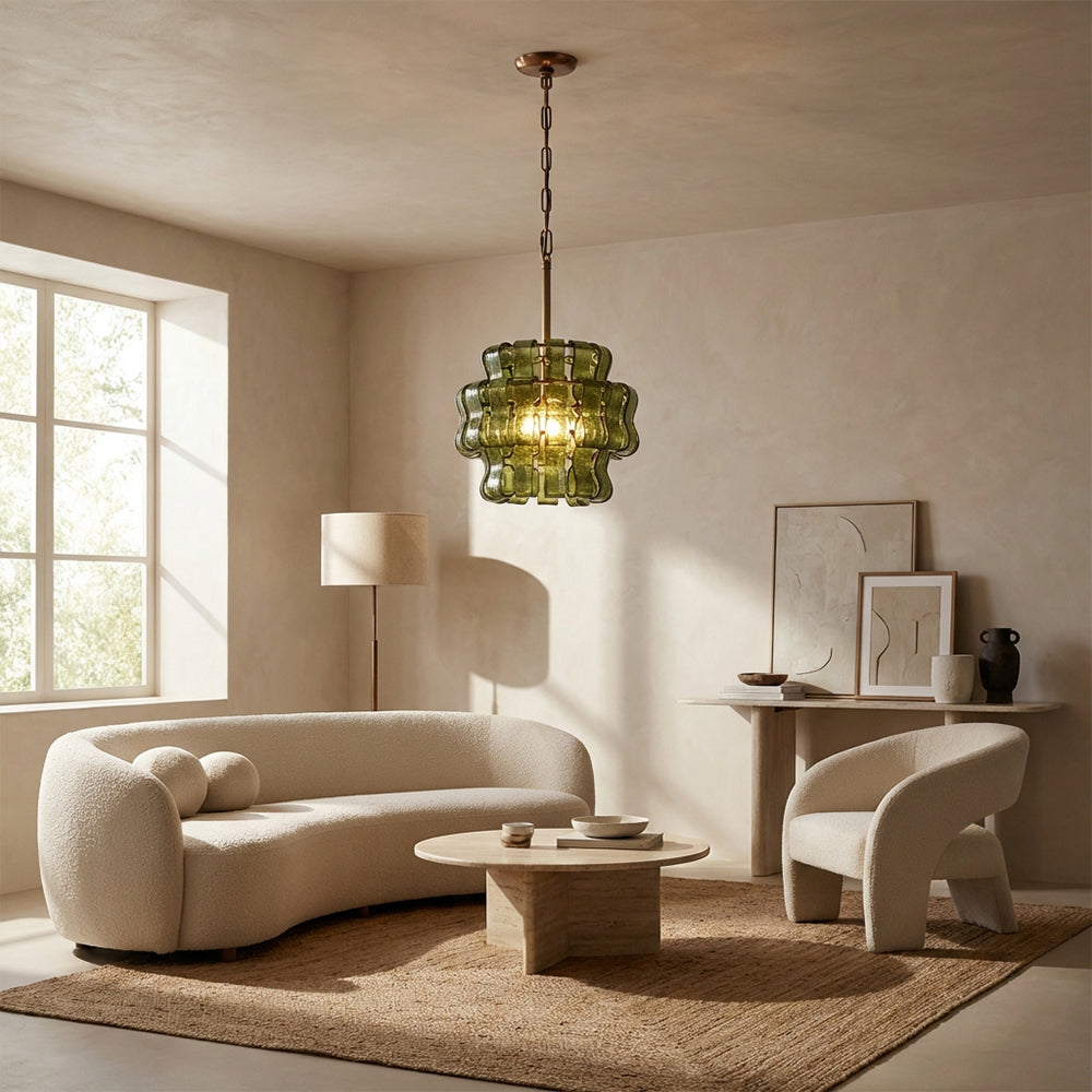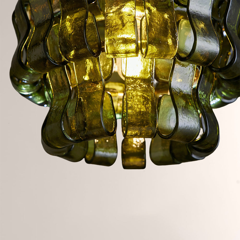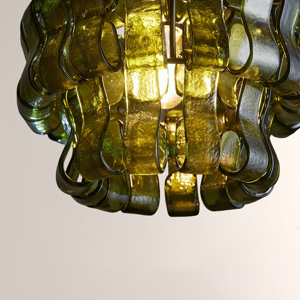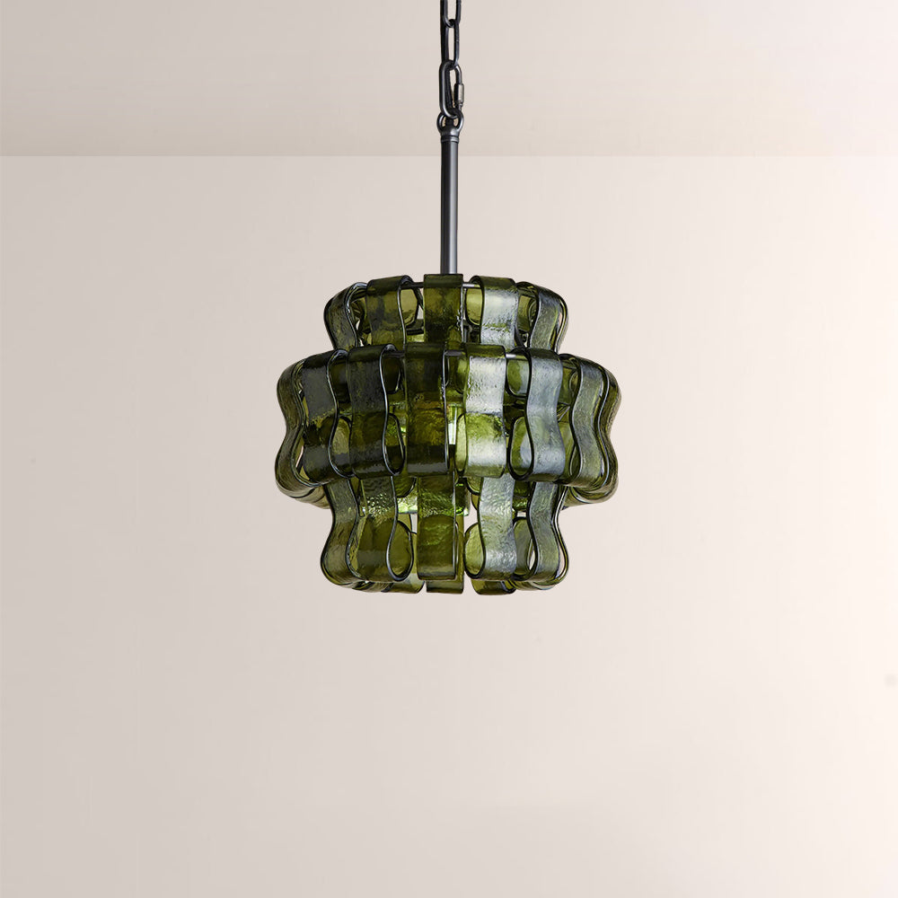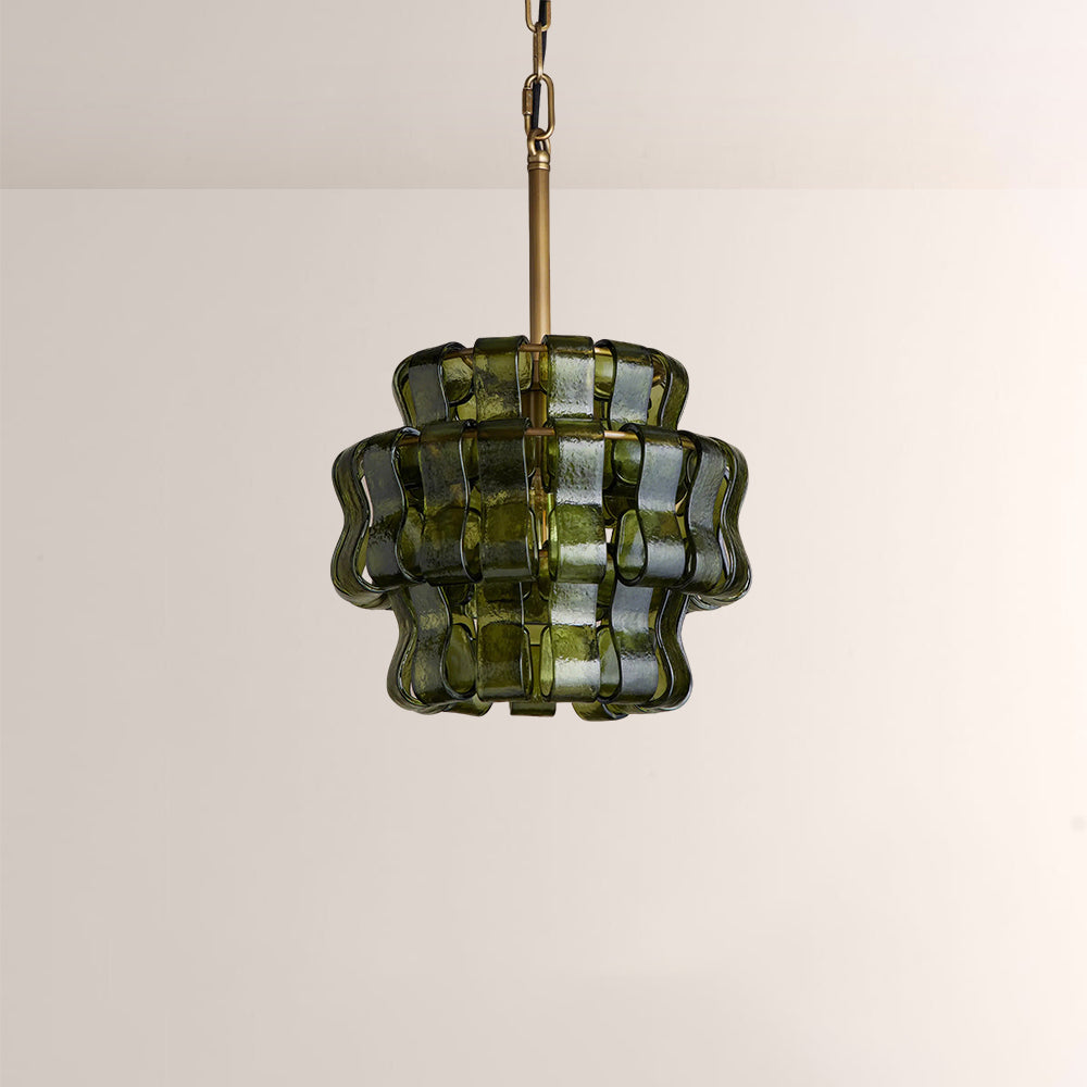 The Ghiaccia Sphere Pendant is a modernist masterpiece, featuring hand-formed, wavy forest green glass tiles woven into a compact, spherical silhouette. Suspended from a matte black or aged brass frame, it casts a rich, emerald-hued glow, elevating intimate dining nooks, powder rooms, and entryways with Italian artisanal luxury and sculptural edge.