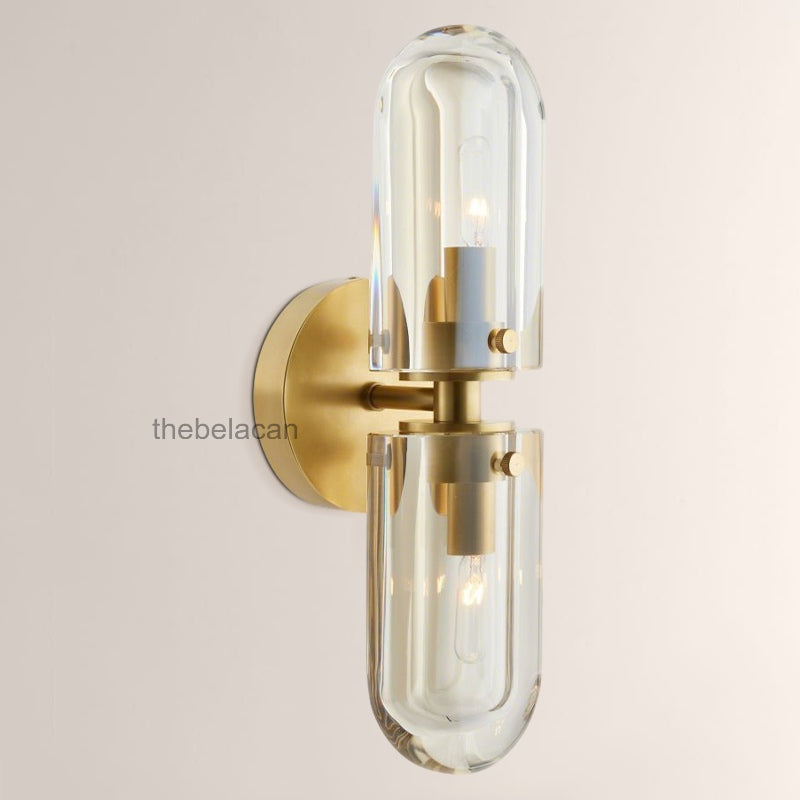 This wall sconce features double clear glass shades and polished brass accents, blending modern simplicity with luxury. Perfect for adding a refined touch to upscale spaces.