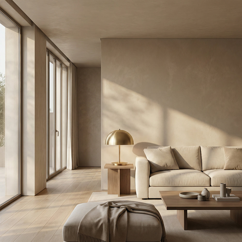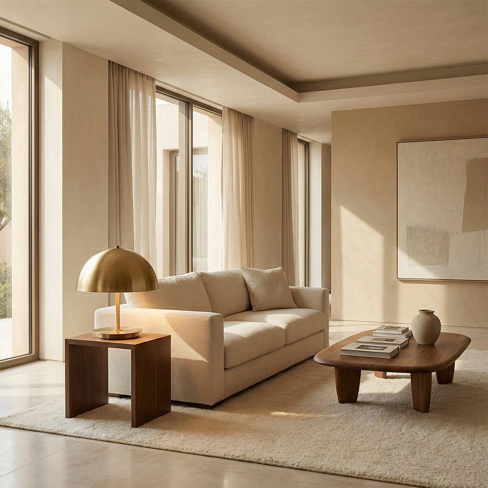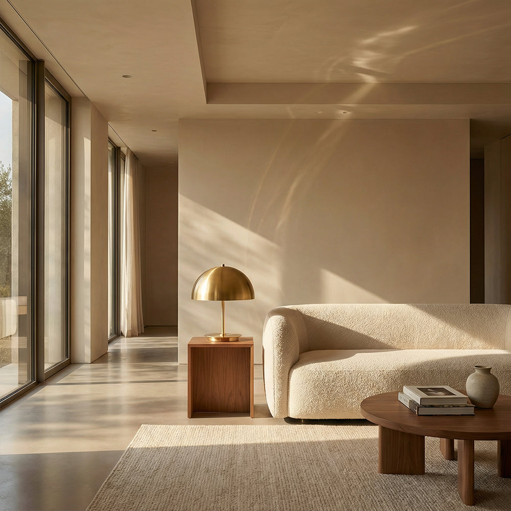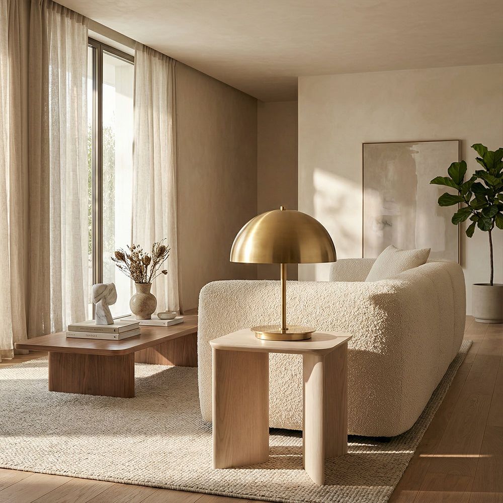 The Malora Dome Table Lamp is a quintessential piece of modern quiet luxury, crafted for discerning American interiors. Available in warm brushed brass or sleek dark bronze, its iconic hemispherical metal shade rests on a slender stem and weighted circular base, blending minimalist geometry with artisanal finish.