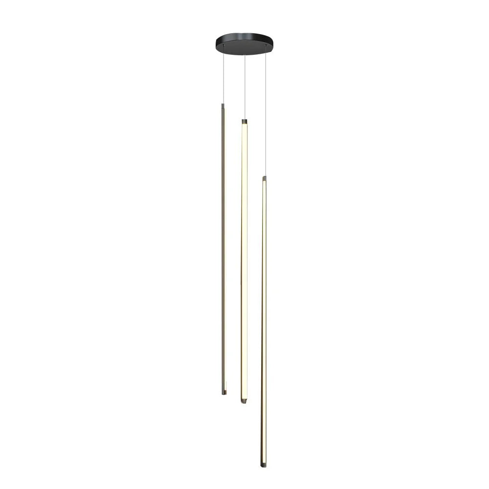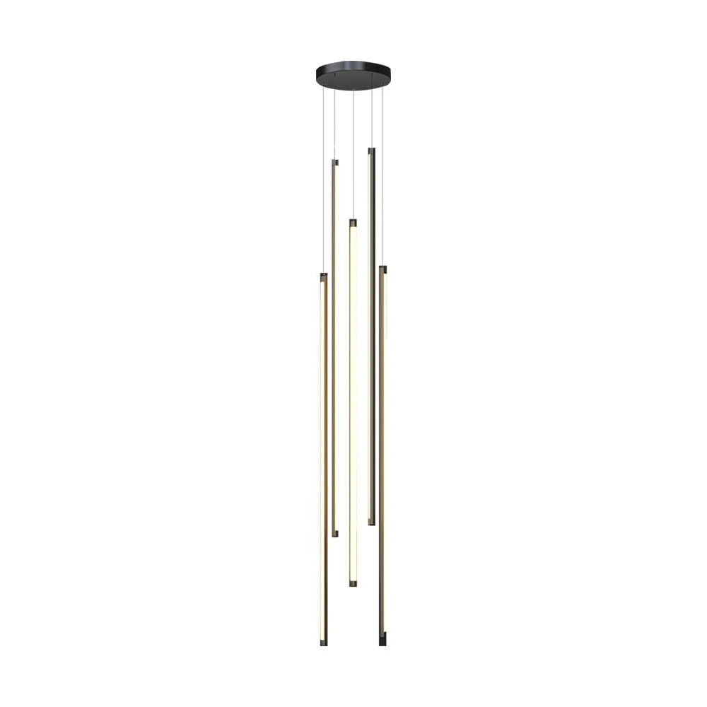 This cascading linear tube pendant light is a minimalist modern masterpiece, featuring sleek metallic LED tubes in varying lengths, suspended by thin wires from a matte black ceiling plate. When illuminated, the warm diffused light emits a soft, rhythmic glow, creating a floating, sculptural effect that elevates stairwells, high-ceilinged foyers, and contemporary luxury interiors with understated geometric elegance.