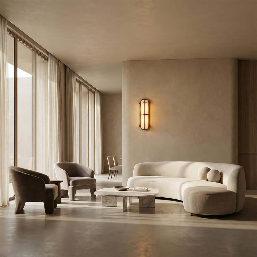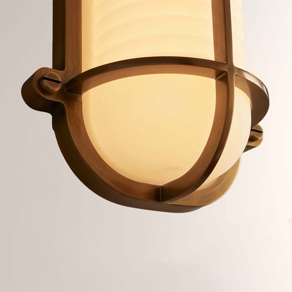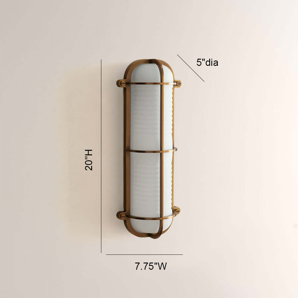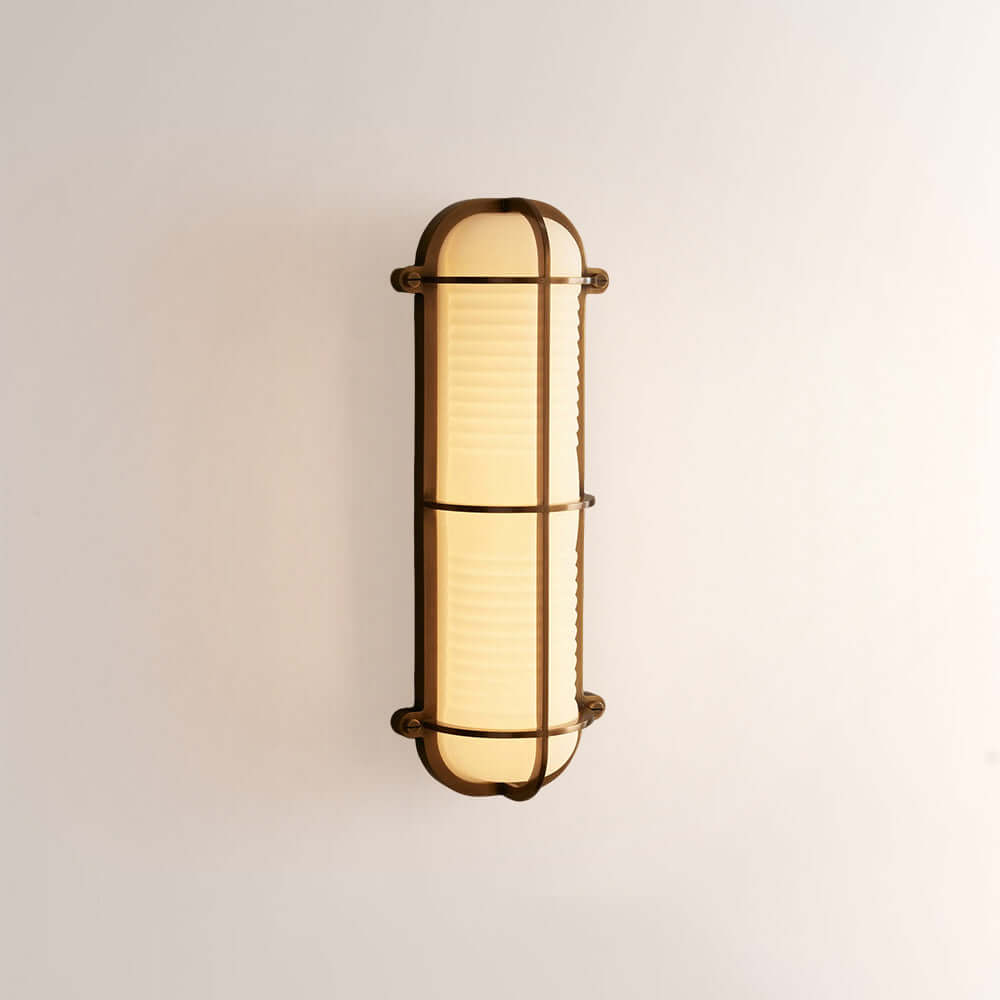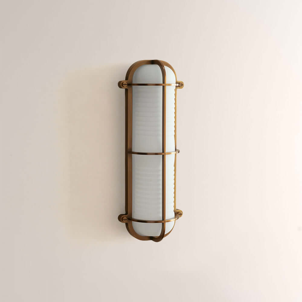 The Solara Wall Sconce reimagines nautical industrial design with a caged metal frame and ribbed frosted glass, available in aged bronze or antique brass. Its rugged yet refined silhouette casts a warm, diffused glow, elevating coastal bathrooms, hallways, and entryways with timeless maritime luxury and industrial edge.