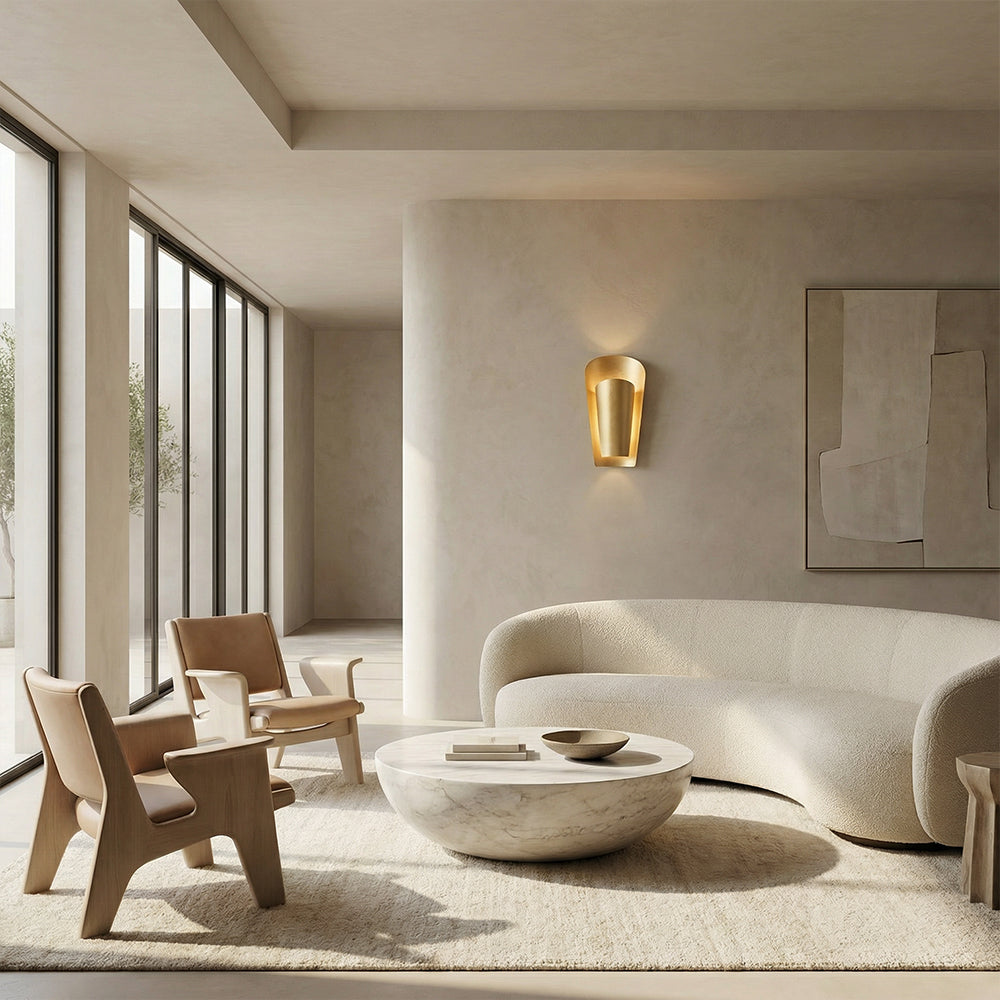 Elevate interiors with the Stella Wall Sconce, a masterpiece of modern Italian design. Crafted from premium brass with a hand-applied champagne leaf finish, its bold, sculptural silhouette creates dramatic ambient lighting. Subtle organic texture variations highlight artisanal craftsmanship. Professional installation is recommended for a seamless, polished look in bathrooms, hallways or living spaces.